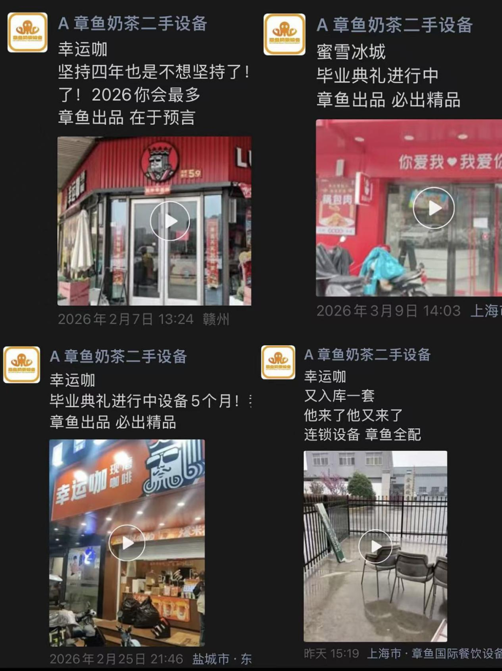 从2月份开始,有关“幸运咖毕业”的内容,动辄就会出现在圈内知名茶饮二手设备商章鱼哥的朋友圈里,没被用来发朋友圈的、进仓库里的设备,更多。他们有的甚至才开了三四个月就坚持不下去,“毕业了”。