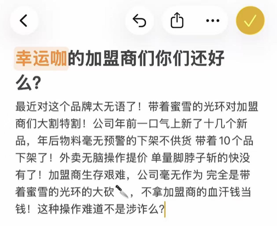 2月中旬,一封《致张总:幸运咖加盟商,真的顶不住了!》的公开信在幸运咖甚至是整个茶饮圈里广为流传。信中,他说自己跟着蜜雪集团走过七八年,手握十余家蜜雪冰城与十余家幸运咖门店;如今也已处在情绪失控的边缘,更遑论那些经验尚浅的“小白”加盟商。